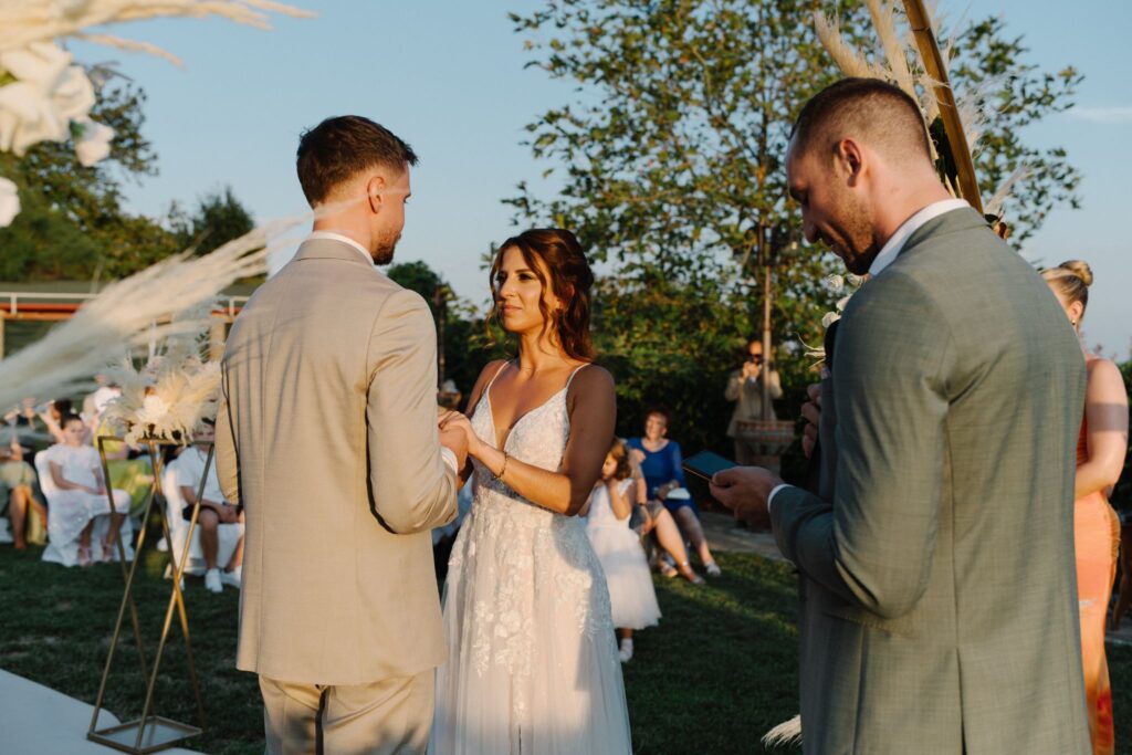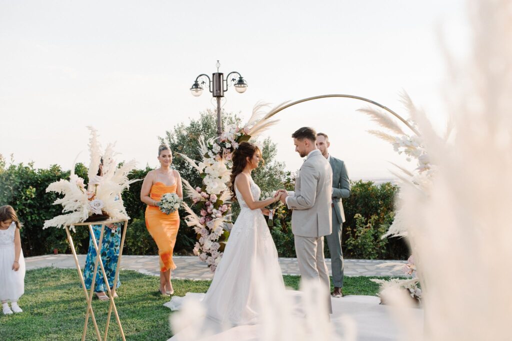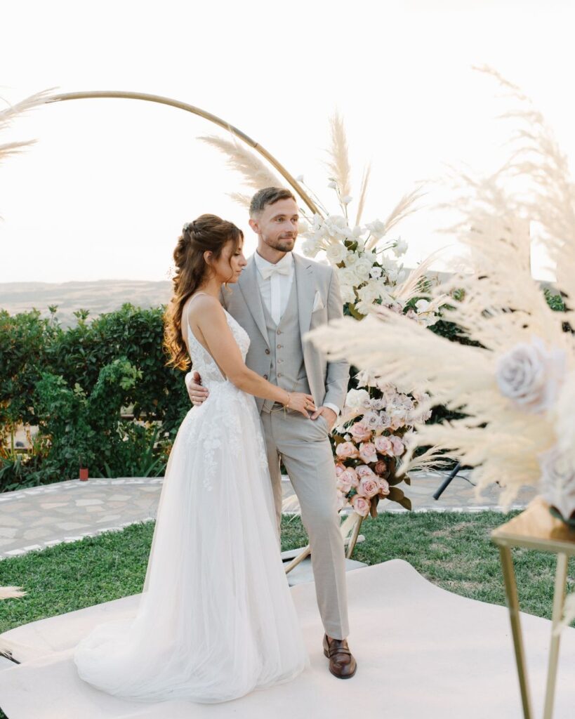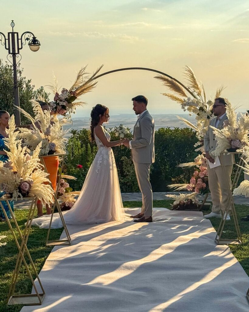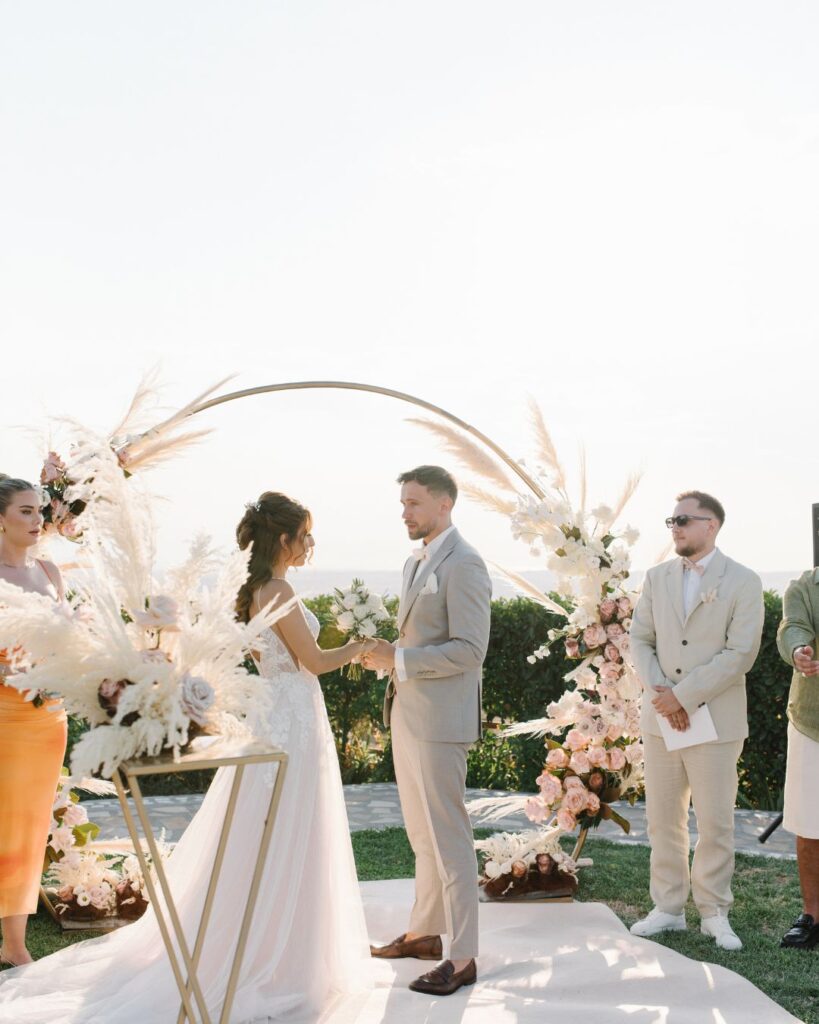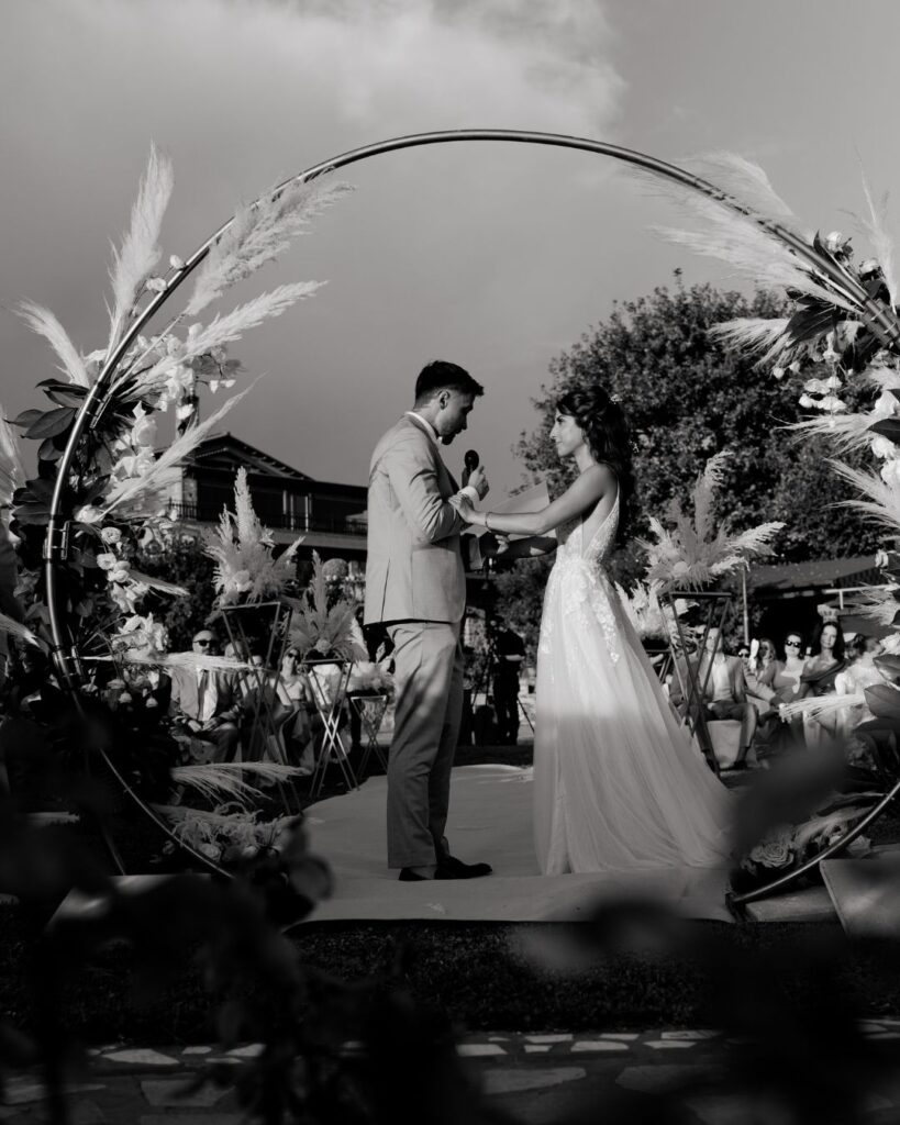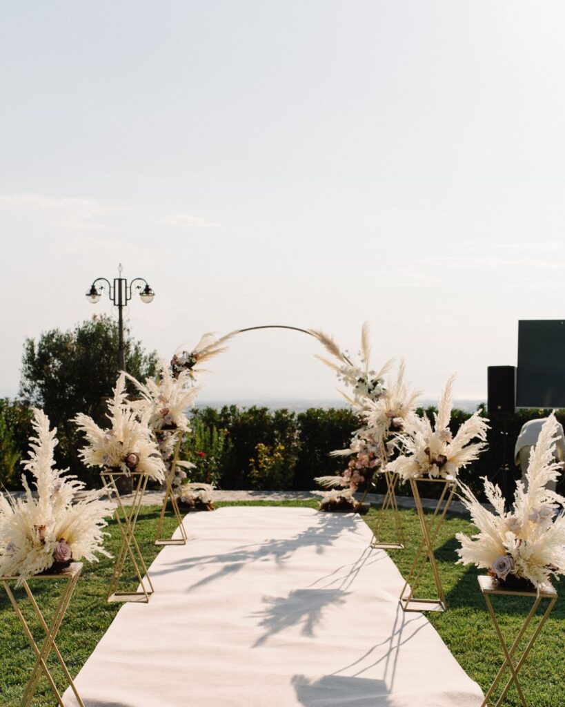 Σε ένα εκπληκτικό κτήμα, οι όρκοι αγάπης της Kiri & του Julio δόθηκαν κάτω από ένα εντυπωσιακό στεφάνι γεμάτο pampas cordials και μοναδικά άνθη, δημιουργώντας μία εικόνα βγαλμένη από παραμύθι. Ο διάδρομος που οδηγούσε στη νέα αρχή του ζευγαριού διακοσμήθηκε με ανθοστήλες γεμάτες χρώματα, δίνοντας έναν ιδιαίτερα ρομαντικό τόνο στην τελετή.