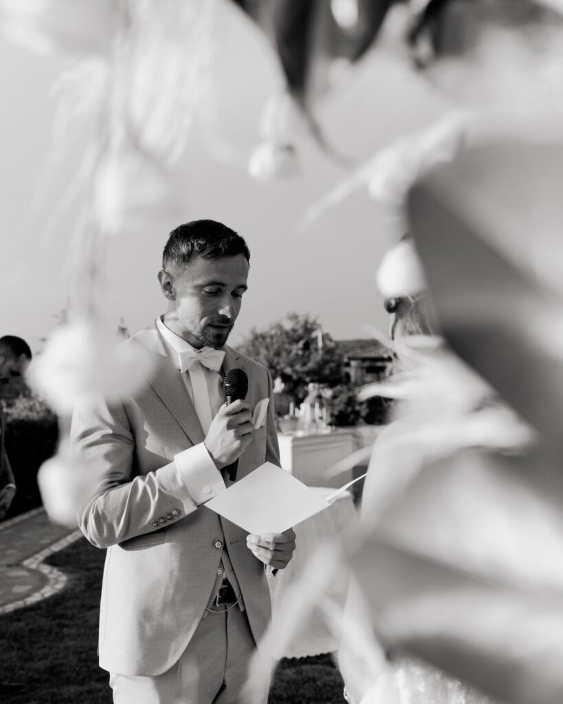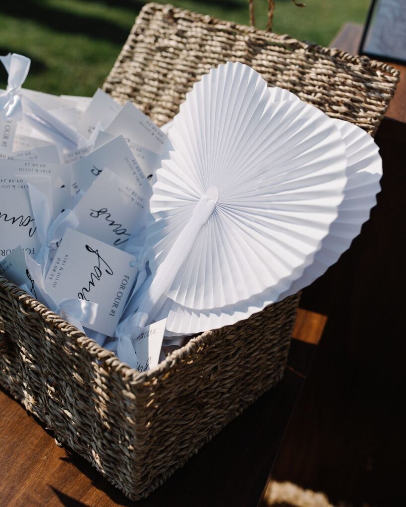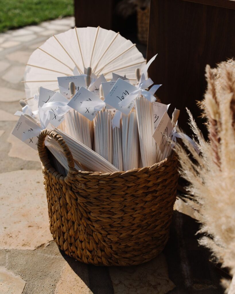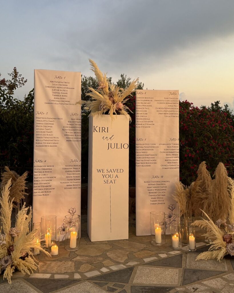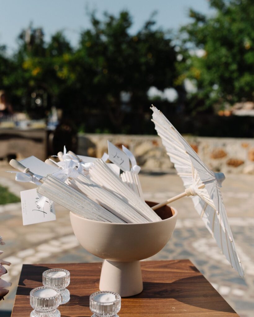 Οι καλεσμένοι απόλαυσαν από την πρώτη στιγμή μία ξεχωριστή εμπειρία, με ειδικά σχεδιασμένες ομπρέλες για τον ήλιο και κομψές βεντάλιες που προσέφεραν μία ιδιαίτερη πινελιά πολυτέλειας. Τα δροσιστικά welcome drinks τους υποδέχτηκαν με την καλύτερη διάθεση, ενώ το tailor-made seating board τους καθοδήγησε με στυλ στα όμορφα διακοσμημένα τραπέζια.