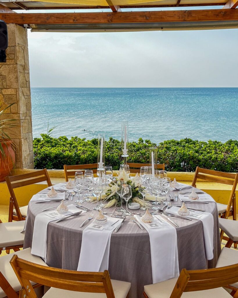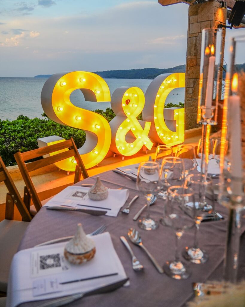 Η βραδιά έγινε ακόμα πιο ονειρική στη δεξίωση με τη πίστα γεμάτη fairy lights και τα λαμπερά αρχικά του ζευγαριού να φωτίζουν το χώρο με φόντο τη θάλασσα! Κάθε τραπέζι είχε τη δική του ξεχωριστή διακόσμηση με candles και floral centerpieces, ενώ οι καλεσμένοι έλαβαν ξεχωριστές κεραμικές μπομπονιέρες ως ενθύμια.