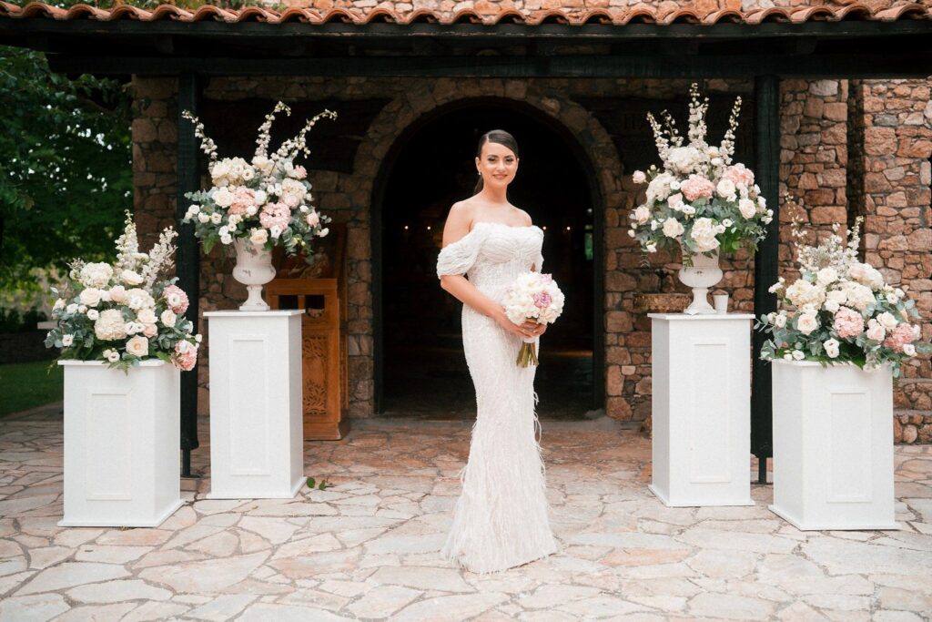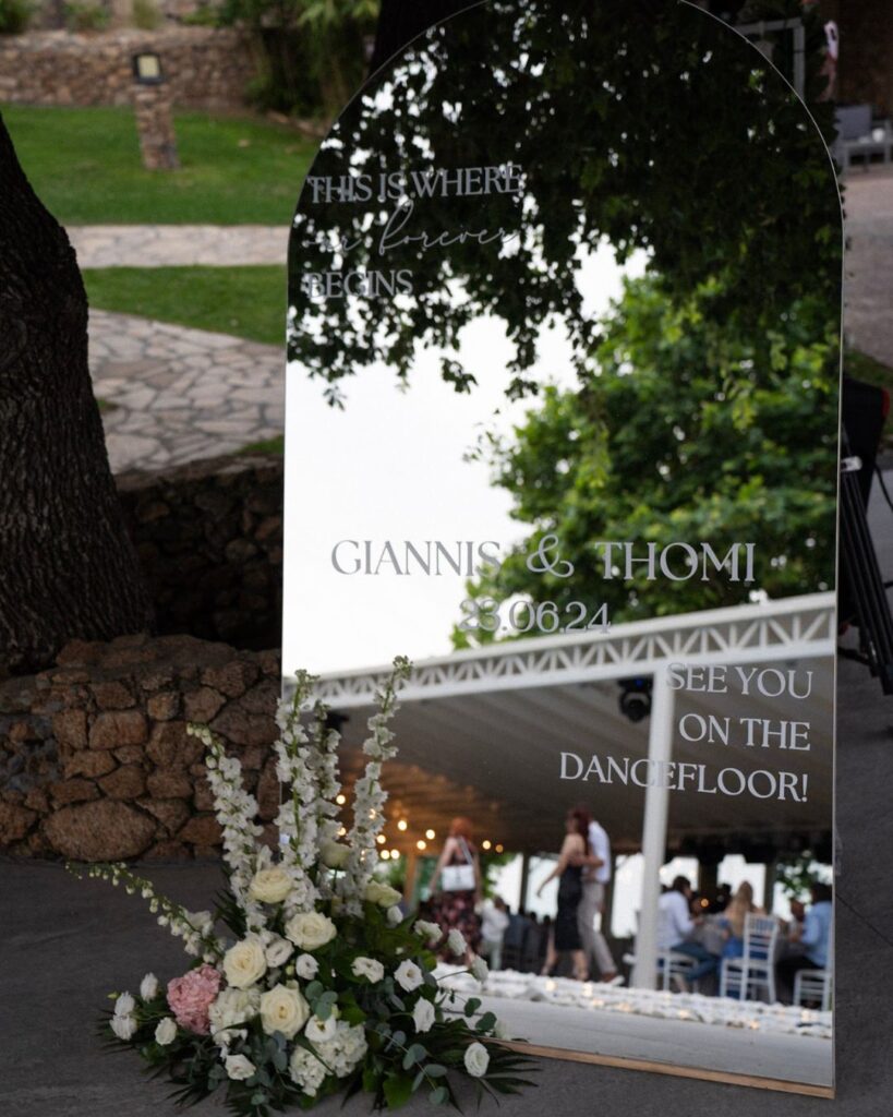 Εντυπωσιακές ανθοσυνθέσεις στήθηκαν δεξιά και αριστερά του γαμπρού, δημιουργώντας μια μοναδική σκηνή για την άφιξη της νύφης. Στη δεξίωση, το ξεχωριστό Welcome Board και ο mirror booth πρόσφεραν μια μοναδική ευκαιρία στους καλεσμένους να απαθανατίσουν τις αγαπημένες τους στιγμές.