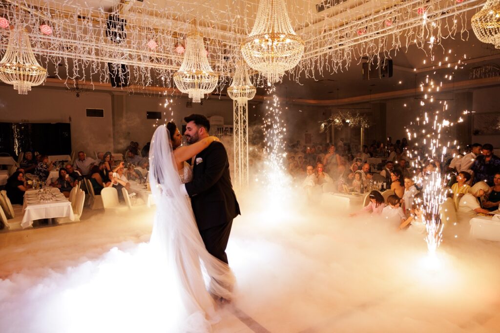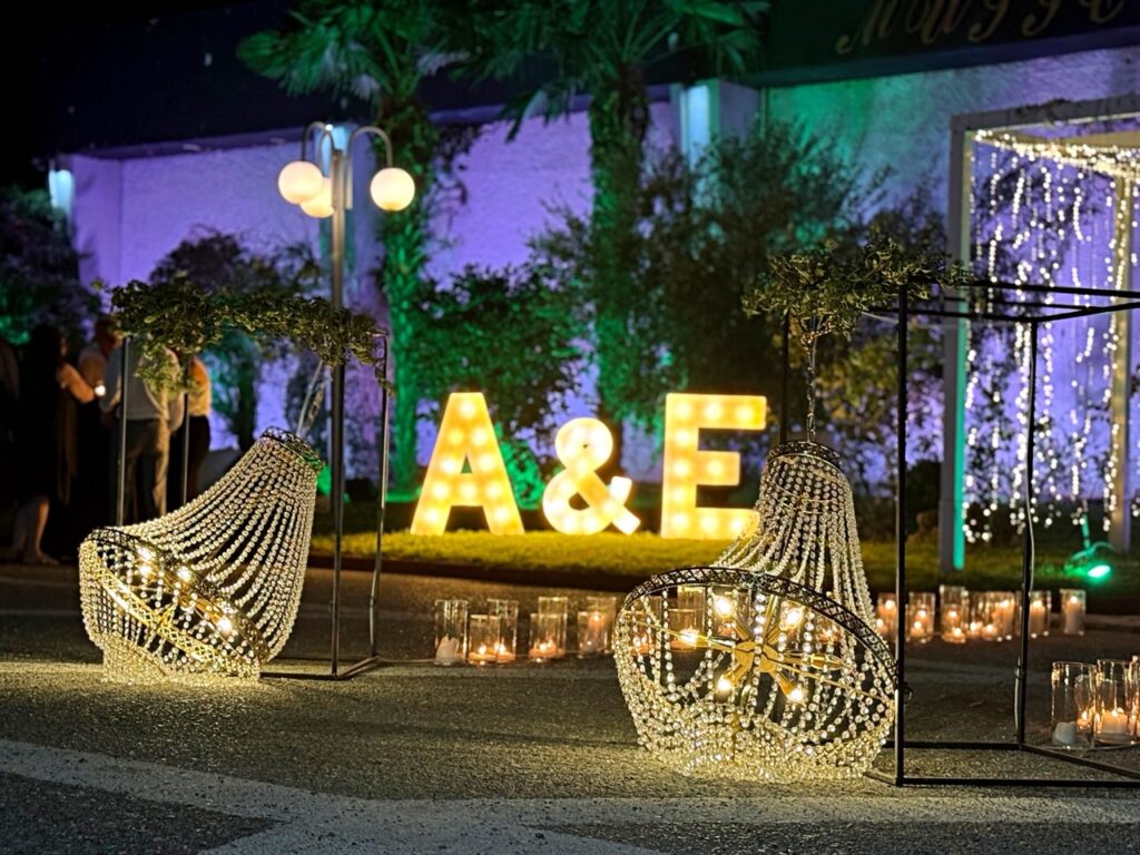 Ένα εντυπωσιακό box με fairy lights και πολυελαίους υψωνόταν πάνω από την πίστα, δημιουργώντας μια ατμόσφαιρα γεμάτη λάμψη και ενέργεια. Κάτω από αυτό, το ζευγάρι και οι καλεσμένοι χόρεψαν ως το ξημέρωμα, μέσα σε έναν κόσμο που έμοιαζε να αιωρείται ανάμεσα στην πολυτέλεια και το όνειρο.