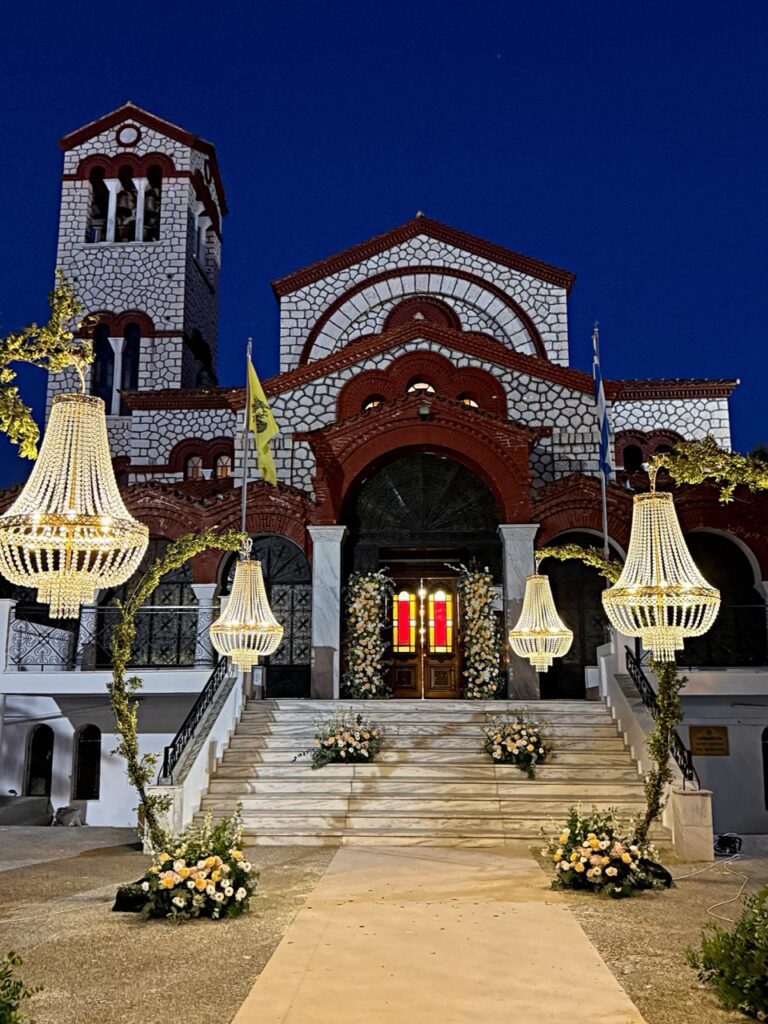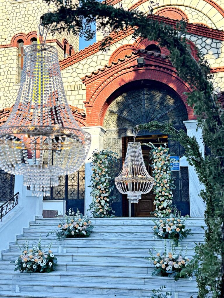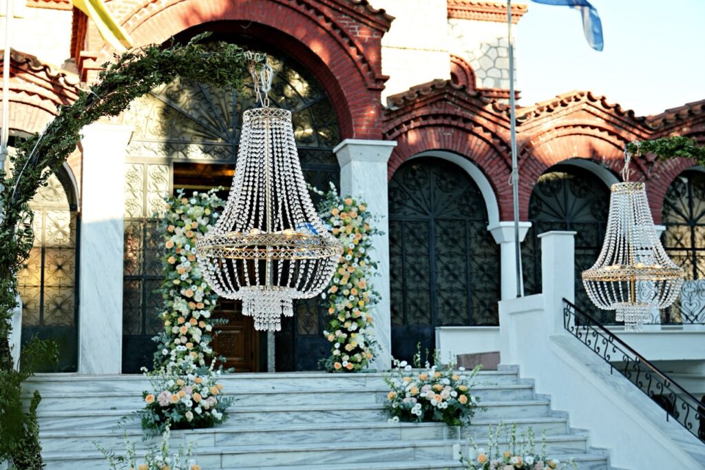 Η εκκλησία μεταμορφώθηκε σε ένα σκηνικό που θύμιζε παραμύθι. Ένας ξεχωριστός wedding aisle απλωνόταν μπροστά στα μάτια των καλεσμένων, πλαισιωμένος από τέσσερις επιβλητικούς κρυστάλλινους πολυελαίους που έλαμπαν απαλά, σαν να οδηγούσαν τη νύφη προς το φως της δικής της ιστορίας.