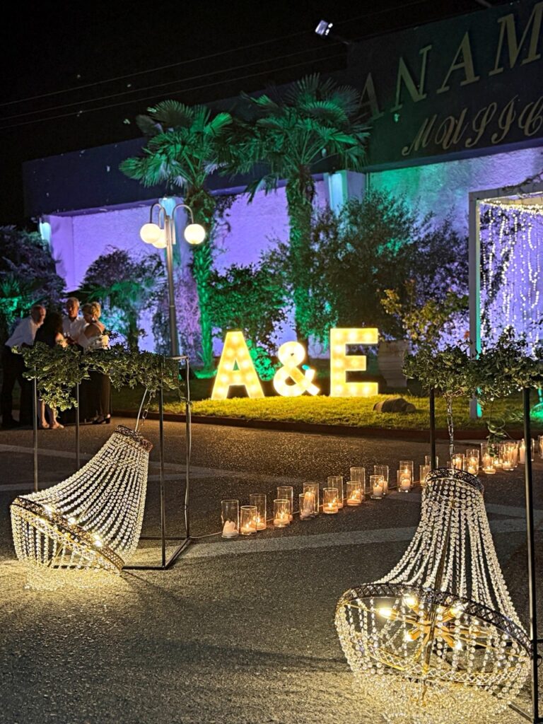 Στην είσοδο του venue, ο διάδρομος με τα κεριά και τους πεσμένους πολυελαίους οδηγούσε σε μια νύχτα που δεν ήθελες να τελειώσει, ενώ τα φωτιζόμενα γράμματα με τα αρχικά του ζευγαριού καθρέφτιζαν κάθε στιγμή αγάπης.