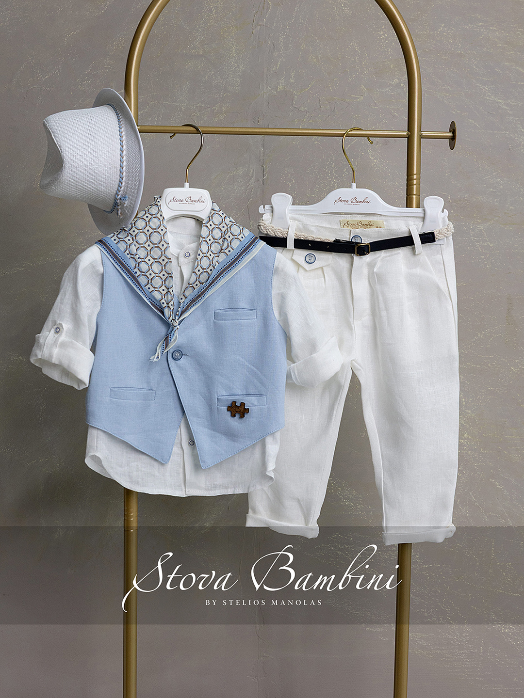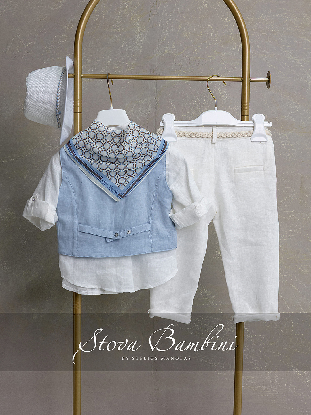 Stova Bambini Βαπτιστικό σύνολο 6 τεμ. από 100% Top Quality Linen. Αποτελείται από λινό Ισπνίας γιλέκο σε σιελ απόχρωση, λινό λευκό πουκάμισο με “Mao” γιακά, λινό παντελόνι λευκό με ζώνη δερμάτινη/πλεκτή και εσωτερικό λάστιχο στην μέση. Το σετ ολοκληρώνεται με υπέροχο Ιταλικό printed φουλάρι και ασορτί καπέλο. Διακριτική λεπτομέρεια ιταλικά κουμπιά με Logo Stova Bambini.