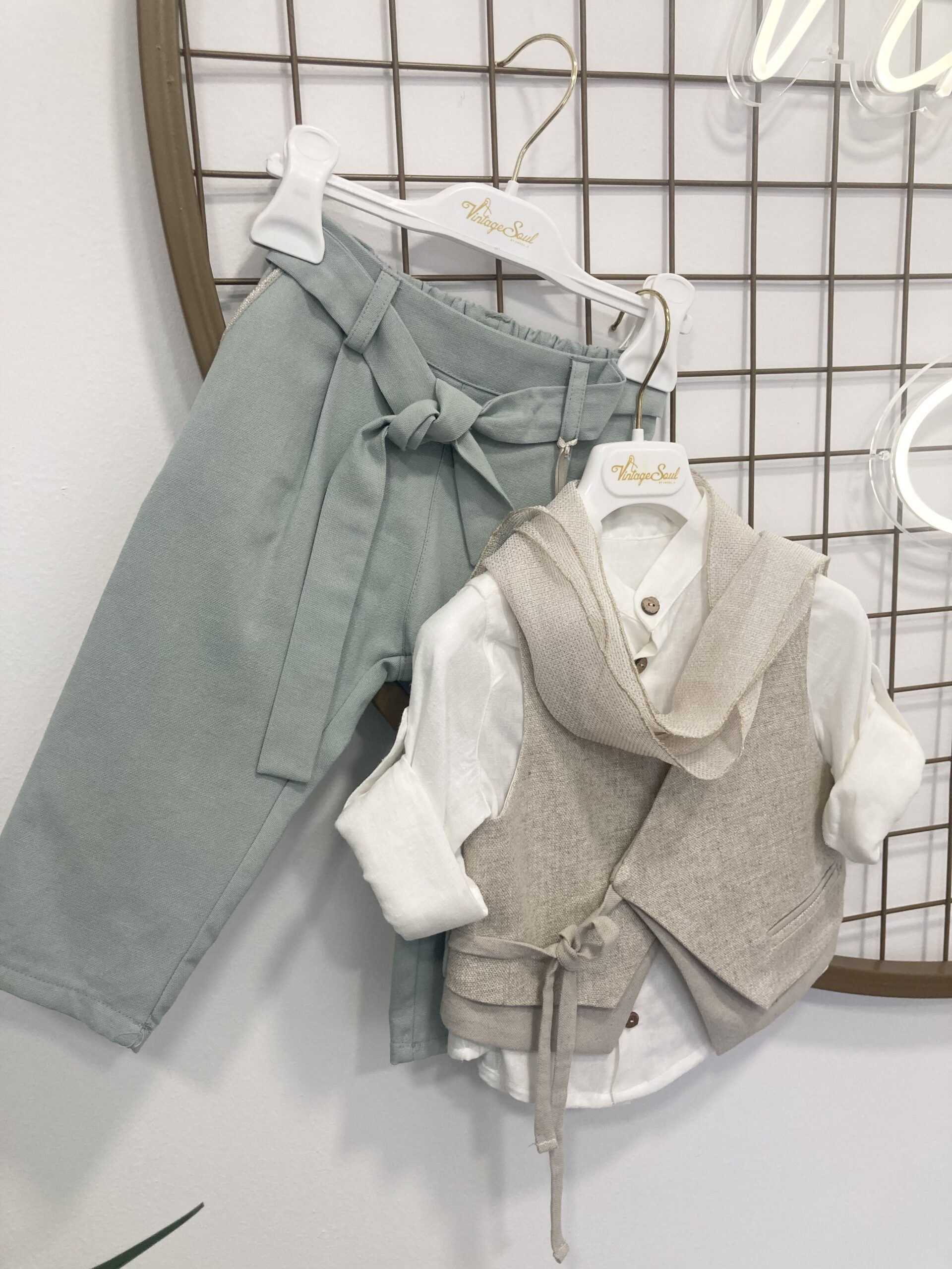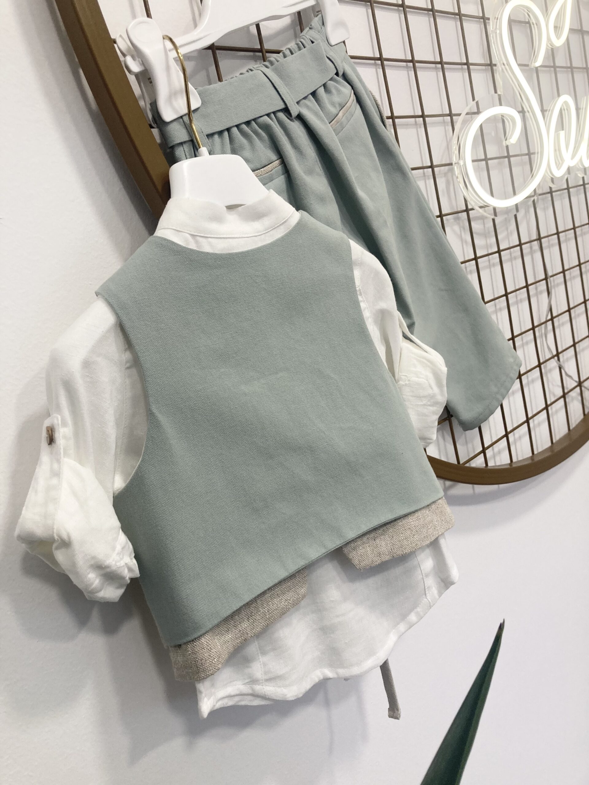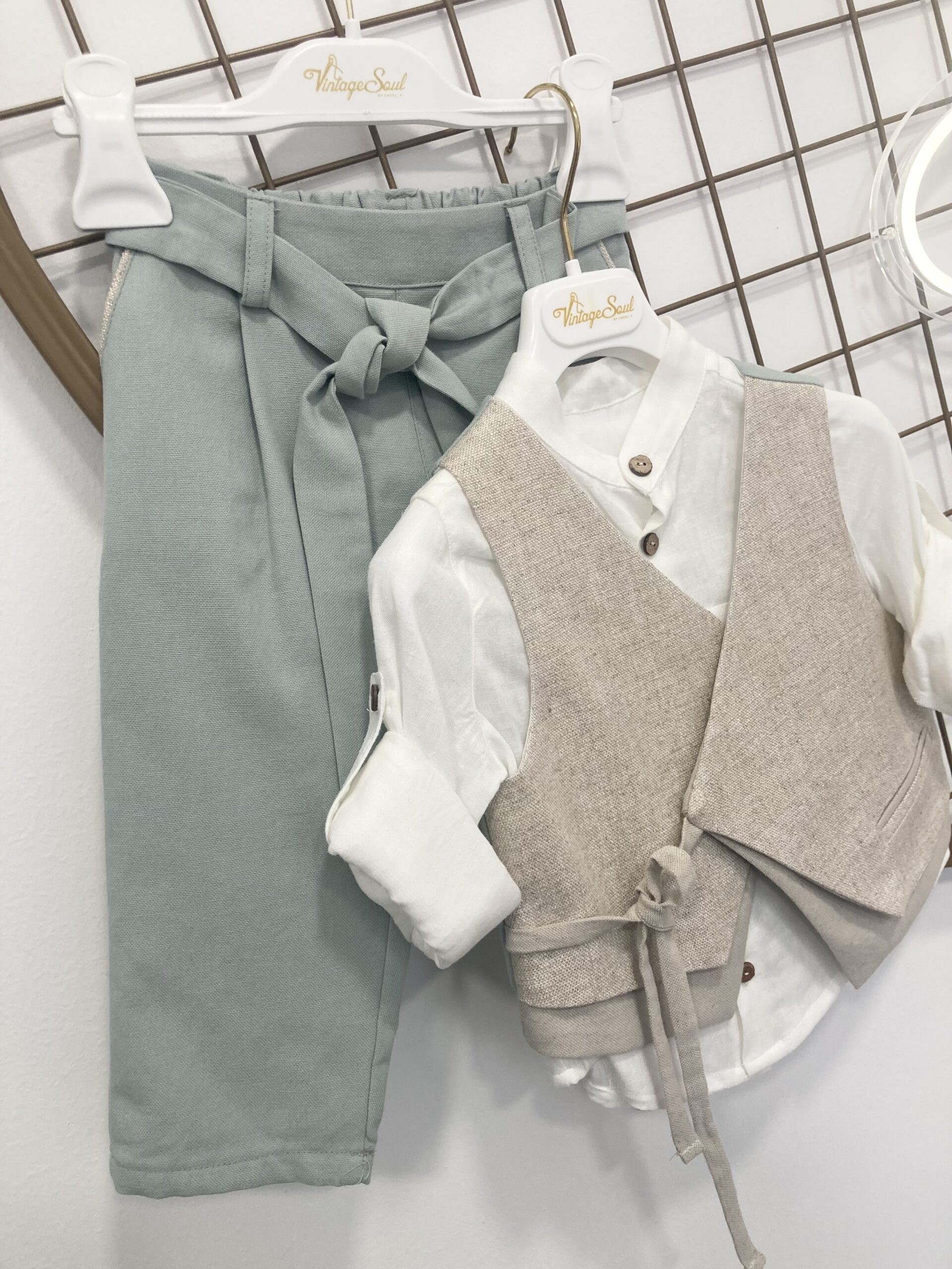 Παντελόνι από 100% βαμβακερό ύφασμα στο χρώμα τις μέντα ,με λάστιχο πίσω και ζώνη από το ίδιο ύφασμα. Λεπτομέρεις στις τσέπες από συνδυασμό υφασμάτων του γιλέκου.Πουκάμισο μάο υπόλευκo λινό/βαμβάκι, μπεζ γιλέκο με λεπτομέρειες και εναλλαγές τριών ,καπέλο τραγιάσκα.