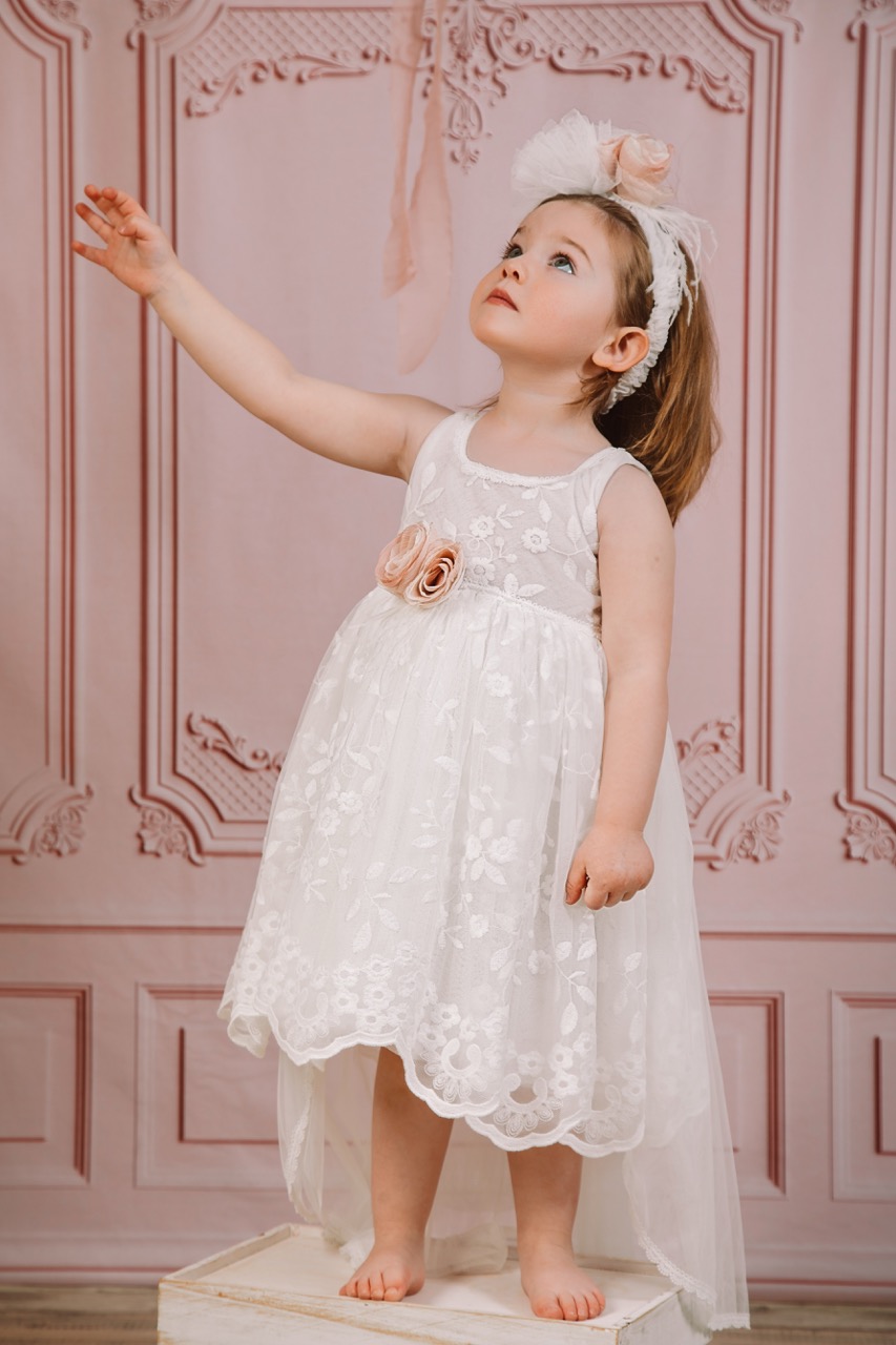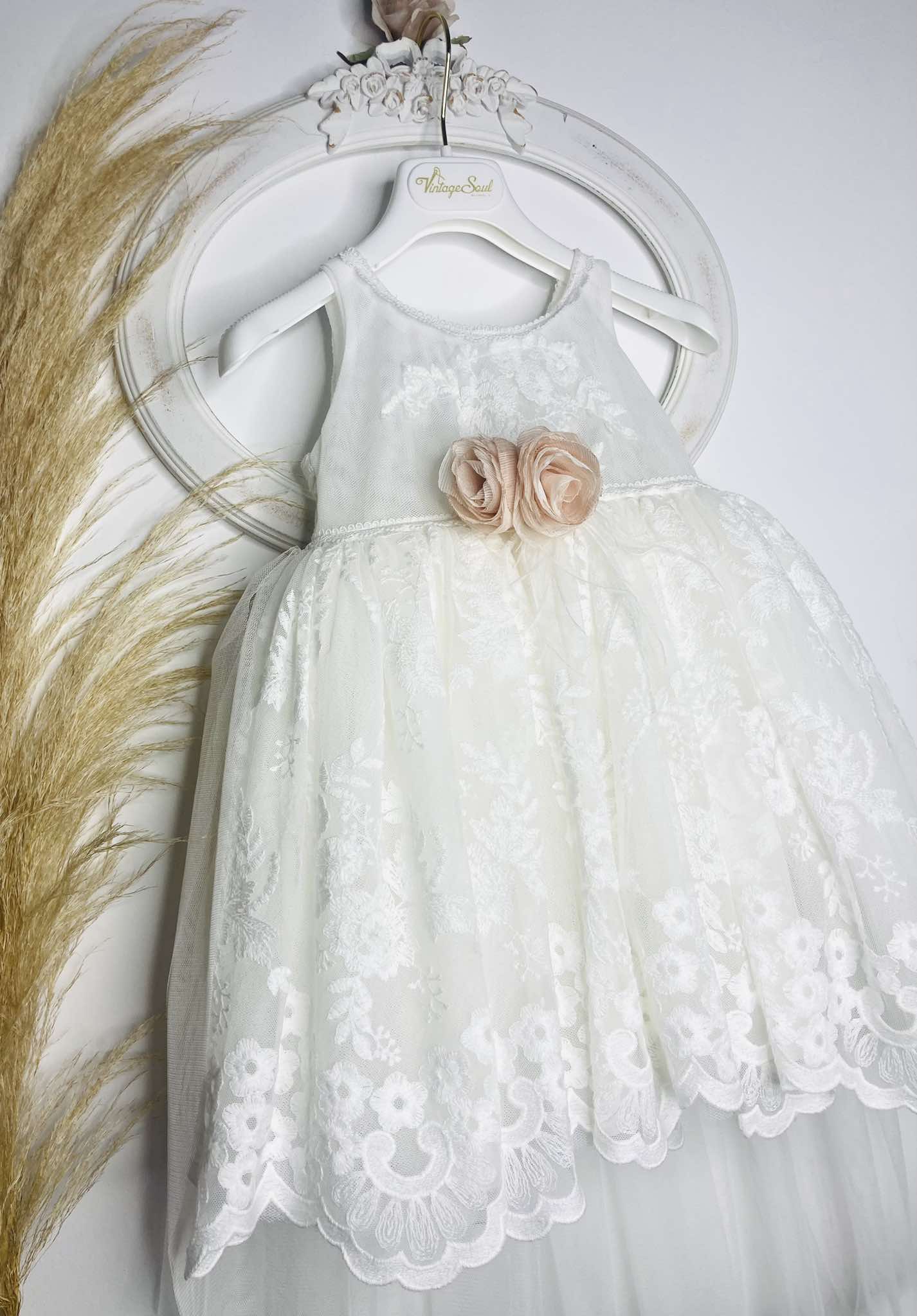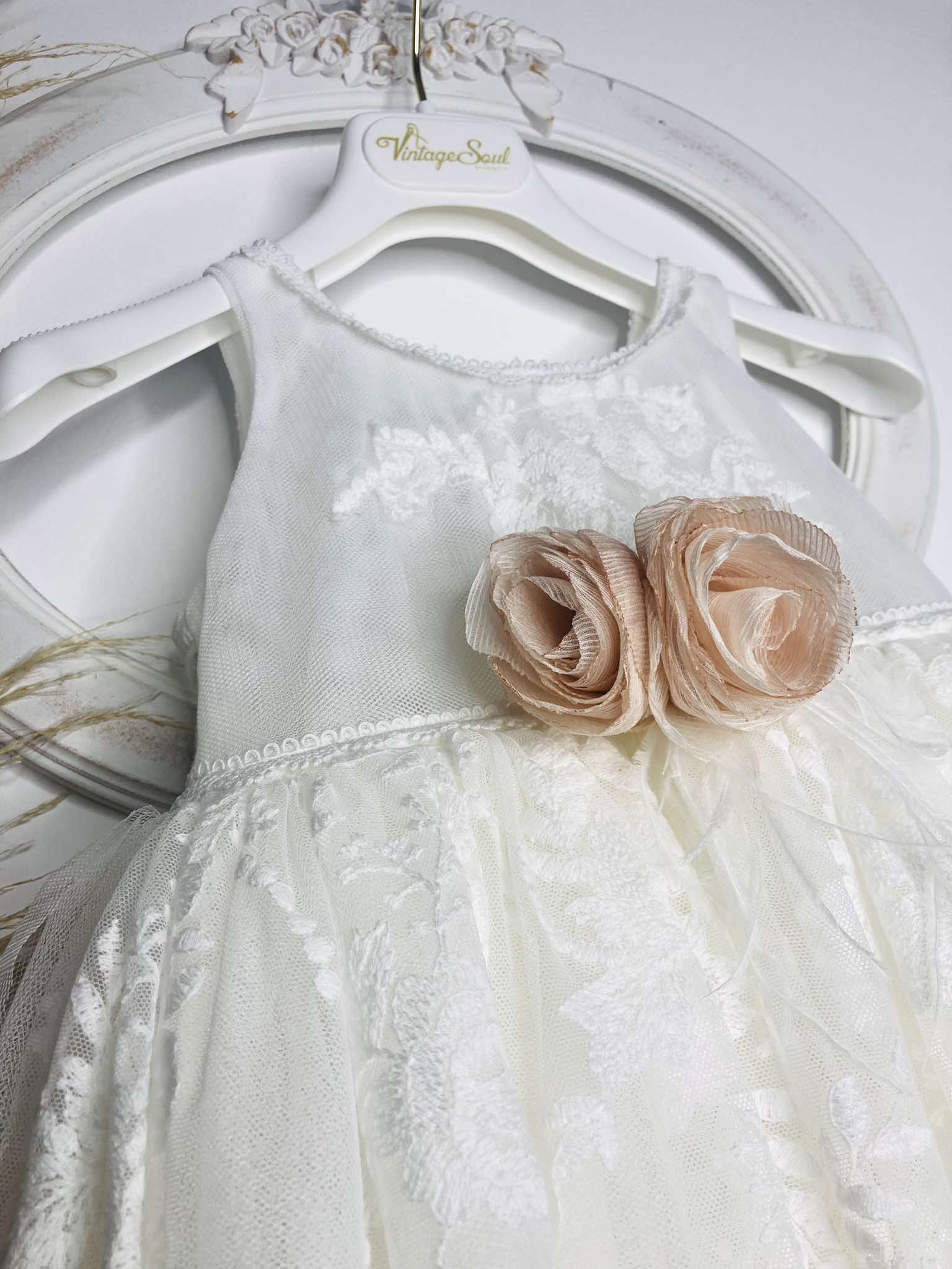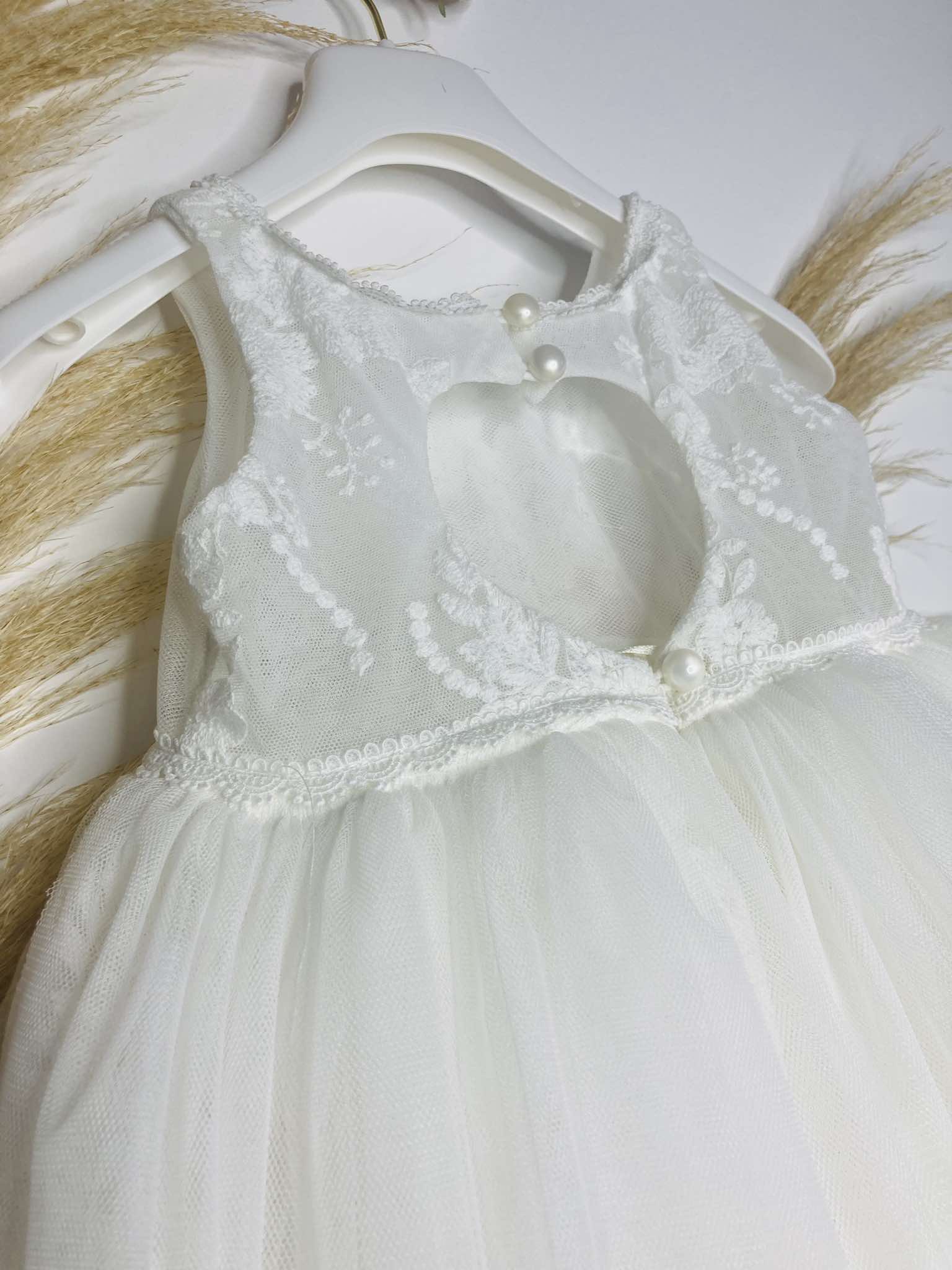 Φόρεμα αμπίρ με δαντέλα κεντημένη στο μπούστο και σχέδιο καρδούλα στην πλάτη. Φούστα από τούλι και δαντέλα με ουρά .