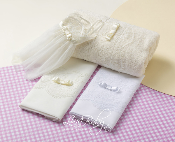 Διαθέσιμο σε δύο εκλεπτυσμένες αποχρώσεις: λευκό και off-white, ιδανικό για βαπτίσεις και ιδιαίτερες περιστάσεις που απαιτούν minimal luxury αισθητική. Πετσέτα 80*140*450gr2. Πετσέτα παπά 30*40*450gr2. Ολες οι πετσέτες της Lina Baby φέρουν την ετικέτα STANDARD 100 by OEKO-TEX® (Αυτό σημαίνει ότι τα προϊόντα δεν περιέχουν επιβλαβή επίπεδα χημικών ουσιών. )
